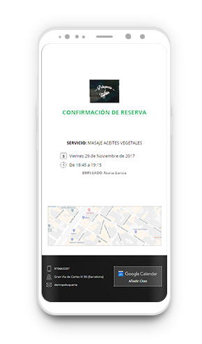 Envía la confirmación de cita por mail, de forma automática, a un cliente que haya programado un servicio. Además podrá consultar la información del establecimiento, acceder a la ubicación desde Google Maps y sincronizar la cita con Google Calendar o con el calendario de su Smartphone.